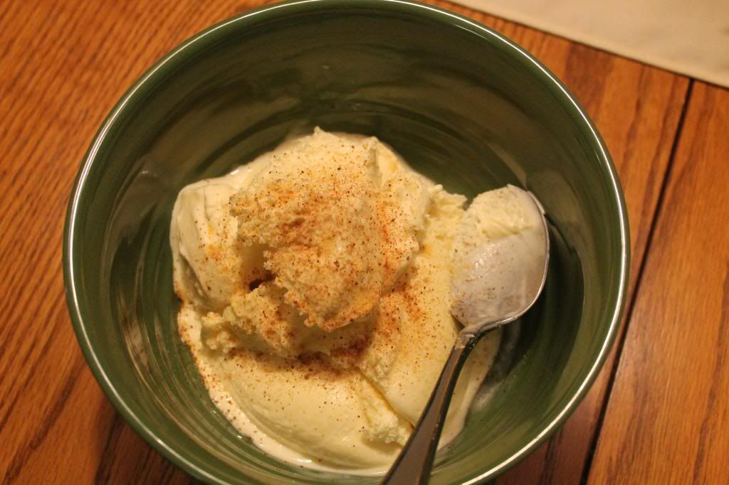 In a medium bowl, break up the ice cream with a spoon, then mix in the nutmeg, ginger, and cloves. Cover the ice cream and return it to the freezer. Keep the ice cream frozen until ready to serve.